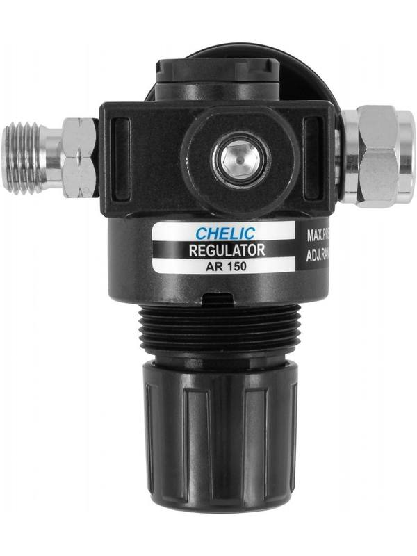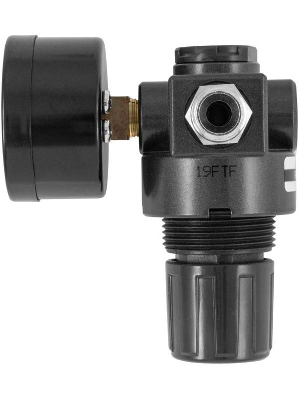 ACC-612 Регулятор воздуха с манометром для "Краскопульта" системы HVLP. Описание Регулятор воздуха с манометром для "Краскопульта". Размер резьбовой части 1/4"PT. Область применения Компактное устройство, применяющееся для контроля и регулировки давления воздуха, поступающего к пневматическому инструменту в диапазоне значений давления от 0 до 10 кгс/смкв.. Регулятор устанавливается непосредственно на рукоятку инструмента с помощью резьбового штуцера.