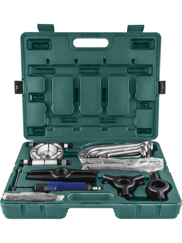 В зависимости от выполняемой работы, набор можно использовать в виде 2-хлапого или 3-хлапого съемника, применяя соответствующие траверсы, захваты трех размеров (100, 150 и 200 мм) и крепежные элементы, или использовать съемник-сепаратор с возможностью установки дополнительных штанг и поперечины, для создания тянущей части. Гидравлический цилиндр, развивающий большое тяговое усилие, устанавливается в резьбовое отверстие траверс или поперечины на глубину, необходимую для доступа к опорной поверхности обслуживаемого узла, но не менее чем на глубину резьбовой части траверсы или поперечины. При осложненном доступе к опорной поверхности рекомендуется использовать входящие в комплект дополнительные удлиняющие насадки толкателя. Для удобства, детали, входящие в состав набора, хранятся в оригинальном пластиковом кейсе.
