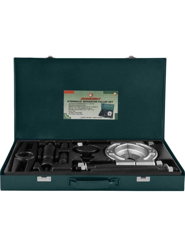 AE310004 Cъемник с сепаратором и гидравлическим цилиндром в наборе, диапазон захватов 105-150 мм, глубина захвата 300 мм, max усилие 10 т., Jonnesway Съемник-сепаратор с комплектом деталей для тянущей части, где в качестве исполнительного механизма, вместо ходового винта, используется гидравлический цилиндр, развивающий большее тяговое усилие, позволяющее применять съемник для проведения демонтажных работ с особонагруженными деталями. Исполнительный механизм гидравлического цилиндра расчитан на максимальное усилие в 10 т. Превышение максимального усилия может привести к поломке механима. Захваты съемника изготовлены из легированной углеродистой стали.