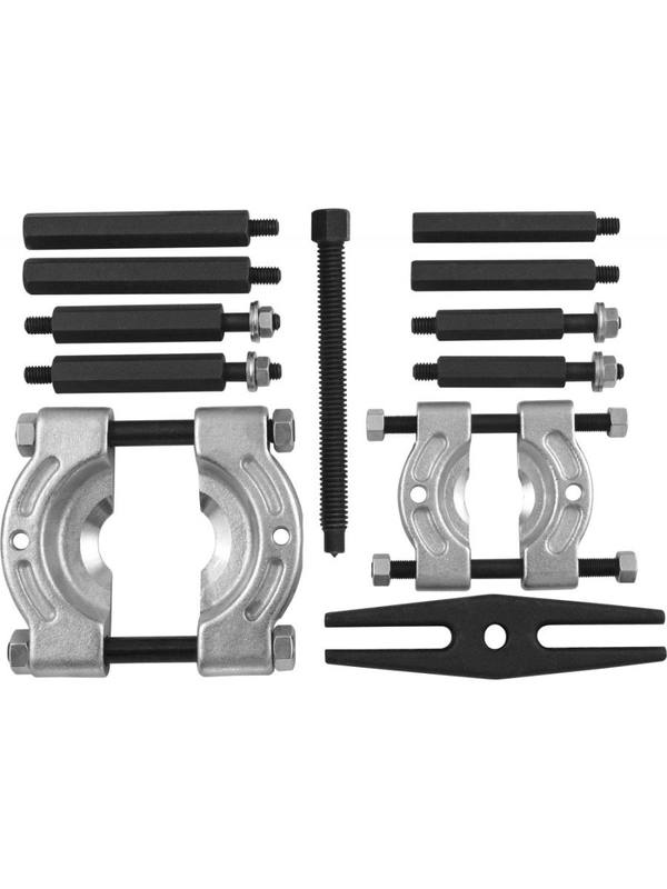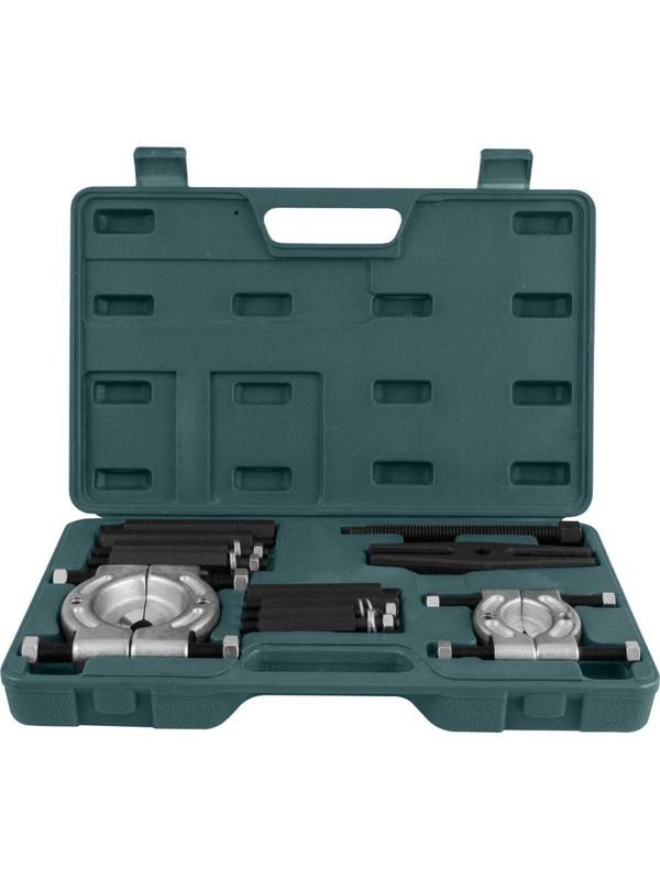 AE310006 Cъемник с сепаратором в наборе, диапазон захватов 30-75 мм, глубина захвата 125 мм. Описание Cъемник с сепаратором в наборе, диапазон захватов 30-75 мм, глубина захвата 125 мм. Рабочий диапазон сепараторов 30-50 и 50-75 мм. Захваты изделия изготовлены, методом ковки, из легированной углеродистой стали, закаленной до твердости HRC 42-45. Детали тянущей части, из углеродистой стали, обеспечивающей надежность конструкции. Для удобства, детали набора хранятся в оригинальном металлическом ящике. Область применения Набор съемников-сепараторов с комплектом элементов для сборки тянущей части, обеспечивающей применение съемников на демонтируемой детали, расположенной на расстоянии до 125 мм от опорной поверхности.