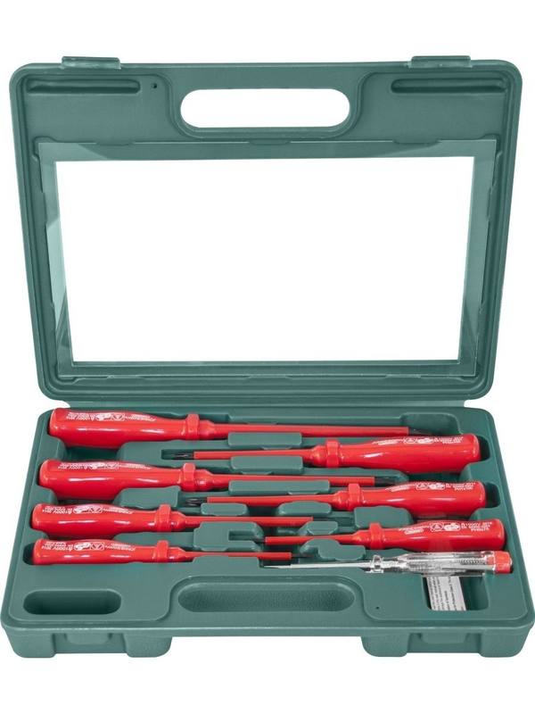 Содержание: - Отвертки шлицевые, SL, 4 шт.: SL0,4х2,5х85, SL0,8-х4,0х100, SL1,0х5,5х125, SL1,2х6,5х150; - Отвертки крестовые, PH, 3 шт.: PH0х75, PH1х100, PH2х200; - Отвертка-тестер; - Пластиковый кейс. Стержневые отвертки - самый распространенный вид инструмента для работы с резьбовыми крепежными деталями, с внутренними рабочими профилями. Эти инструменты компактны, не требуют дополнительных операций по сборке, снабжены эргономичными рукоятками.Стержневые диэлектрические отвертки применяются для производства работ с электрооборудованием, находящимся под напряжением до 1000 В. Изолирующие рукоятки обеспечивают защиту оператора от поражения электрическим током согласно всем требованиям стандарта VDE, соответствующего IEC 60900, полностью отвечают требованиям ГОСТ 21010-75. Название: D02AP08S Набор отверток стержневых диэлектрических, 8 предметов.