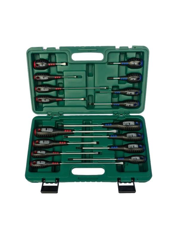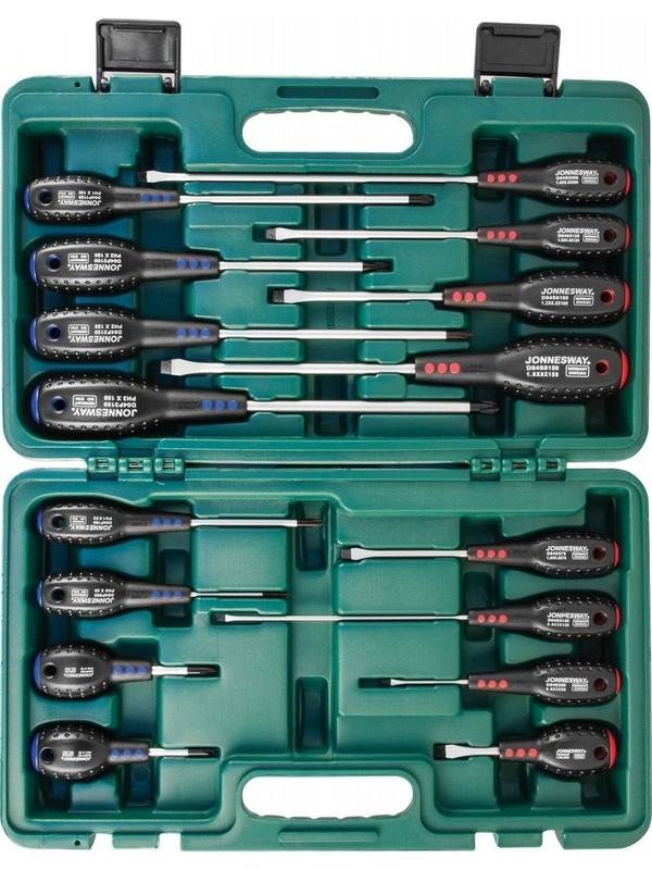 Набор отверток FULL STAR Jonnesway D04PP16S состоит из 16 инструментов - восемь отверток, имеющих прямой профиль и восемь отверток, снабженных крестовой головкой. Инструменты разного профиля отличаются друг от друга цветными вставками на корпусе рукоятки. Каждая отвертка подписана и имеет отверстие для подвески. Удобное хранение Набор отверток FULL STAR Jonnesway D04PP16S - грамотно размещен в футляре из пластика, который закрывается на защелки. Транспортировка Кейс снабжен рукояткой, с помощью которой можно легко перенести чемоданчик. Оптимальная передача усилия Рукоятки отверток сужаются к месту крепления стержня, такая конструкция позволяет значительно увеличить крутящий момент. Преимущества Наконечники отверток оксидированы; На рукоятках имеются отверстия; Ручки имеют удобные гладкие затыльники; Полимер, из которого изготовлены рукояти не скользит в руке; Прочные стержни из специального сплава. Комплектация Шлицевая отвертка 3х50; Шлицевая отвертка 5,5х75; Шлицевая отвертка 3х150; Шлицевая отвертка 6,5х38; Шлицевая отвертка 5,5х200; Шлицевая отвертка 8х150; Шлицевая отвертка 5,5х125; Шлицевая отвертка 6,5х100; Крестовая отвертка 1х38; Крестовая отвертка 0х60; Крестовая отвертка 1х150; Крестовая отвертка 2х38; Крестовая отвертка 2х150; Крестовая отвертка 2х100; Крестовая отвертка 3х150; Крестовая отвертка 1х80; Кейс.