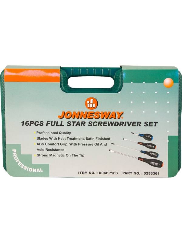 D04PP16S Набор отверток стержневых FULL STAR, 16 предметов. Стержневые отвертки - самый распространенный вид инструмента для работы с резьбовыми крепежными деталями, с внутренними рабочими профилями. Эти инструменты компактны, не требуют дополнительных операций по сборке, снабжены эргономичными рукоятками. Стержневая отвертка популярной серии JONNESWAY "FULL STAR", изготовлена в соответствии с требованиями стандарта DIN 5262, отвечает техническим условиям ГОСТ 17199-88. Изделие комплектуется высококачественным стержнем из хромомолибденованадиевой стали, намагниченная рабочая часть отвертки в состоянии удерживать крепеж, что очень часто помогает при работе в труднодоступных местах, а изготовленна из бензомаслостойкого АБС пластика рукоятка удобно лежит в руке.Набор отверток "D04PP16S" применяется для проведения работ со всеми видами крепежа, имеющего внутренний рабочий профиль SL и PH. .